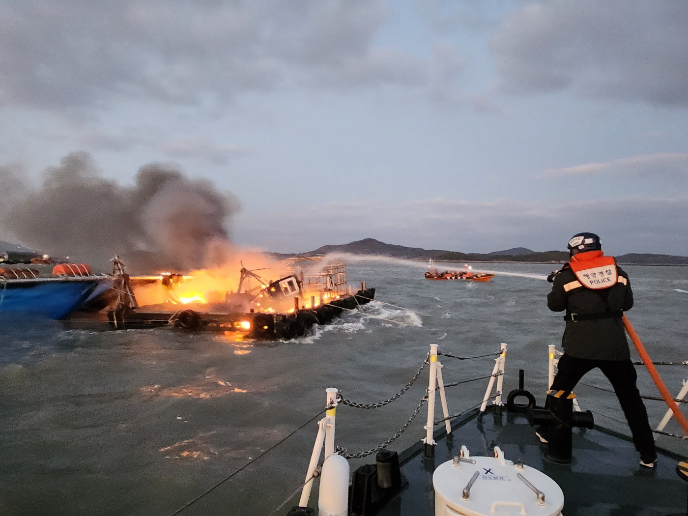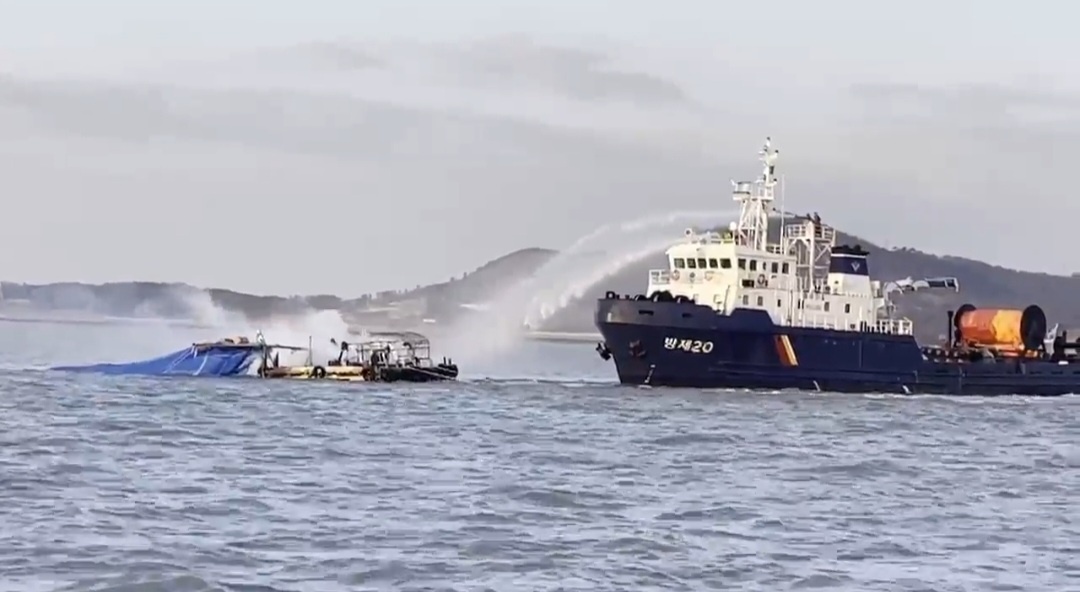 사고 접수 15분만인 오전 6시 16분께 현장에 도착한 해경 경비함정은 즉시 고속단정을 내려 소화 장비를 이용해 화재를 진화하고 방제정을 동원, 잠재 화재를 처리했다.