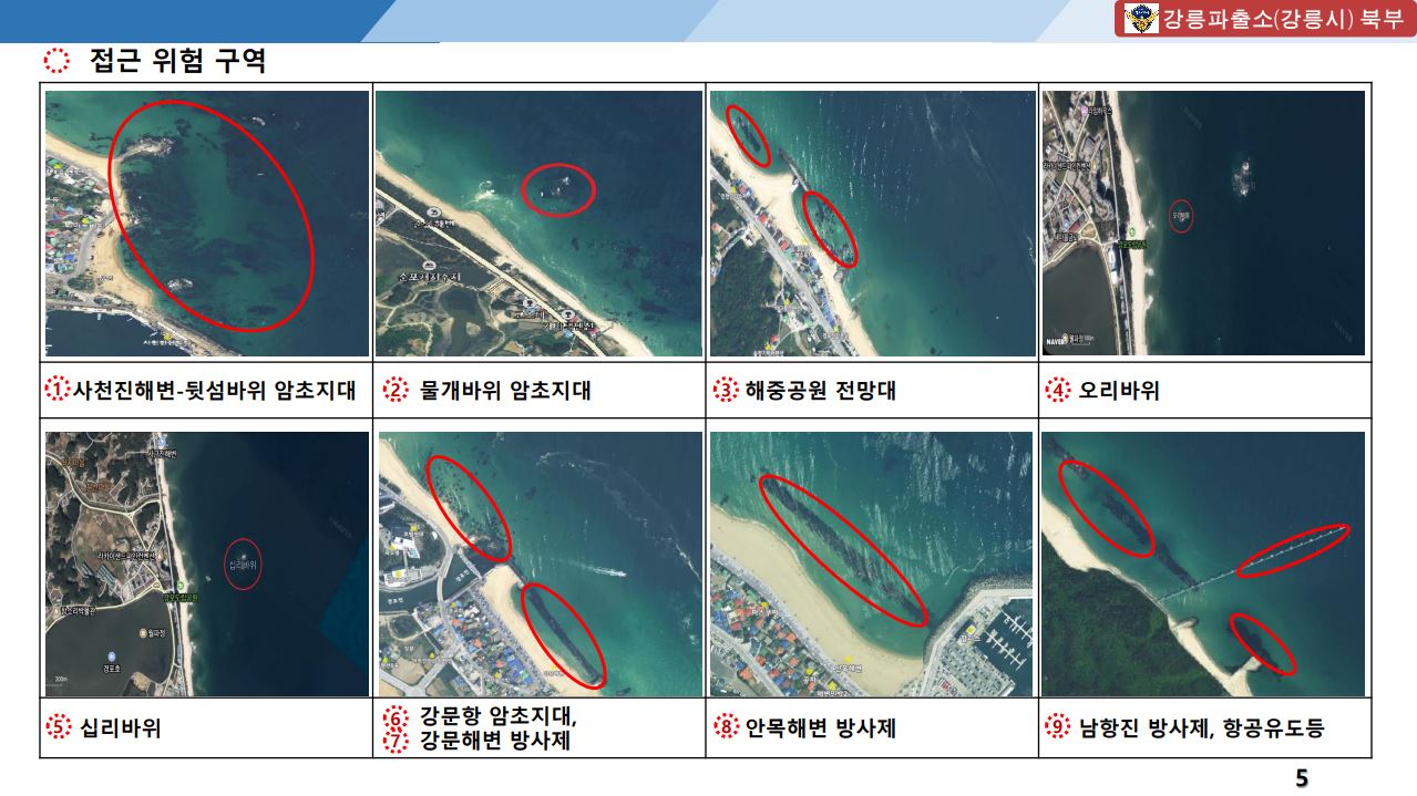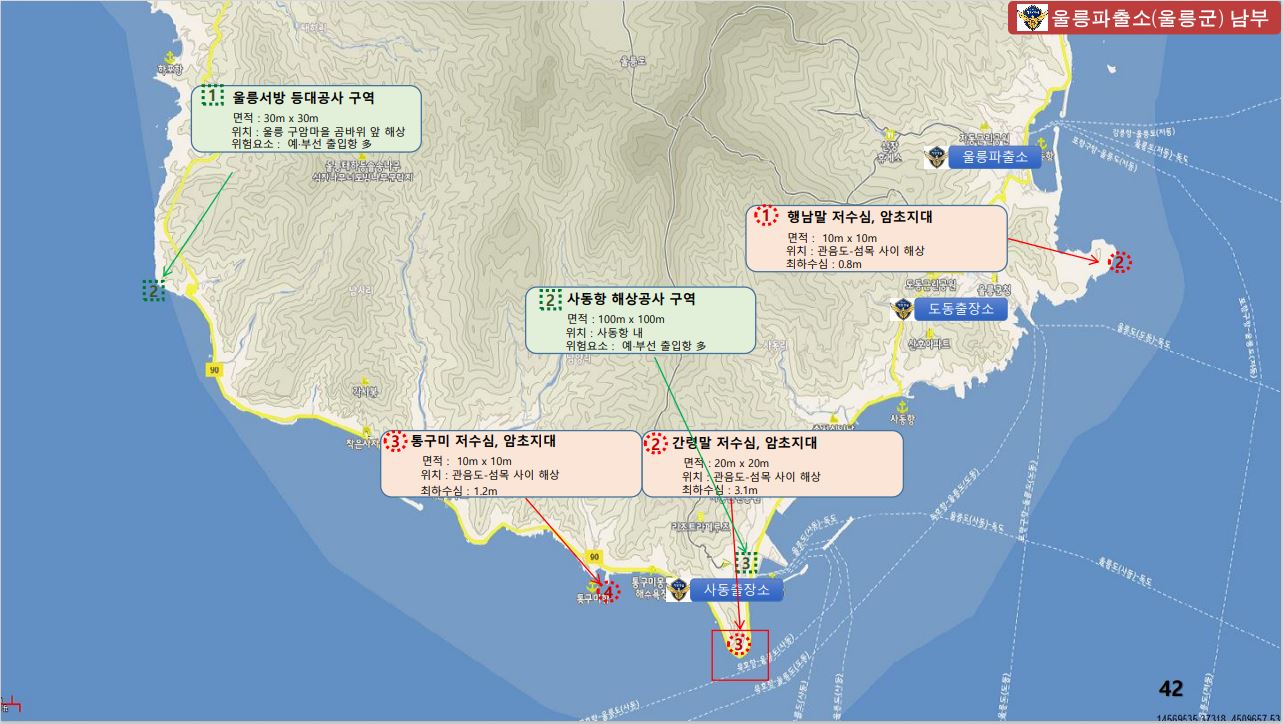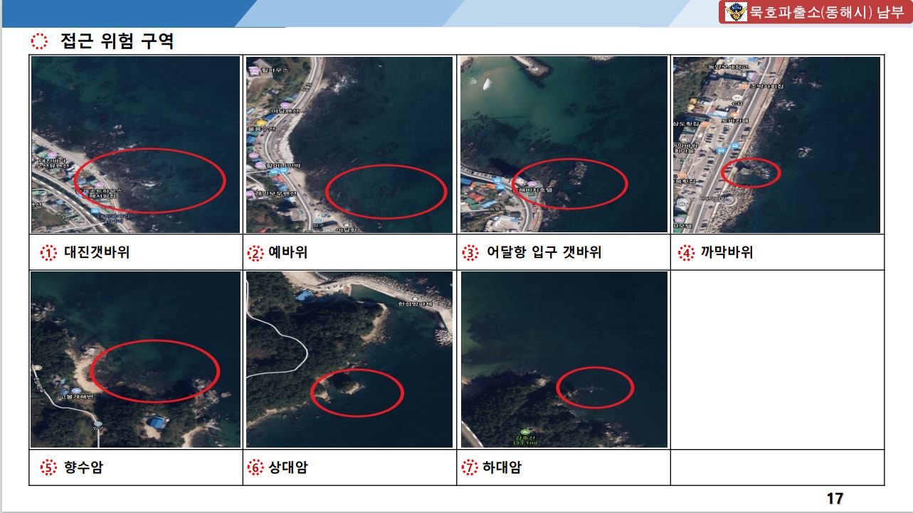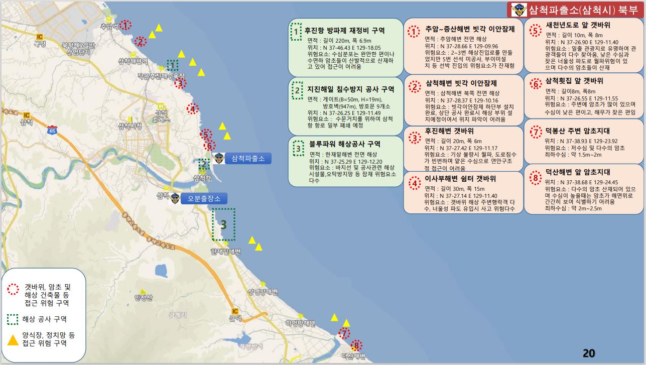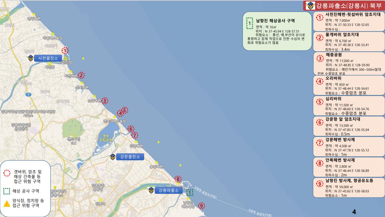 동해해경은 연안해역의 암초, 해상공사 등에 따른 항해 위험물 증가로 선박의 안전항해에 장애를 초래하는 위험요소를 파악하여 “연안 위험지형 지도”를 지난달 21일 제작하였고, 파출소 연안구조정과 경비함정 등의 항행사고를 예방하기 위해 내부적으로 배부하여 활용 중, 활용범위를 민간에 까지 확대하여 연안 사고예방에 활용한다는 방침이다.