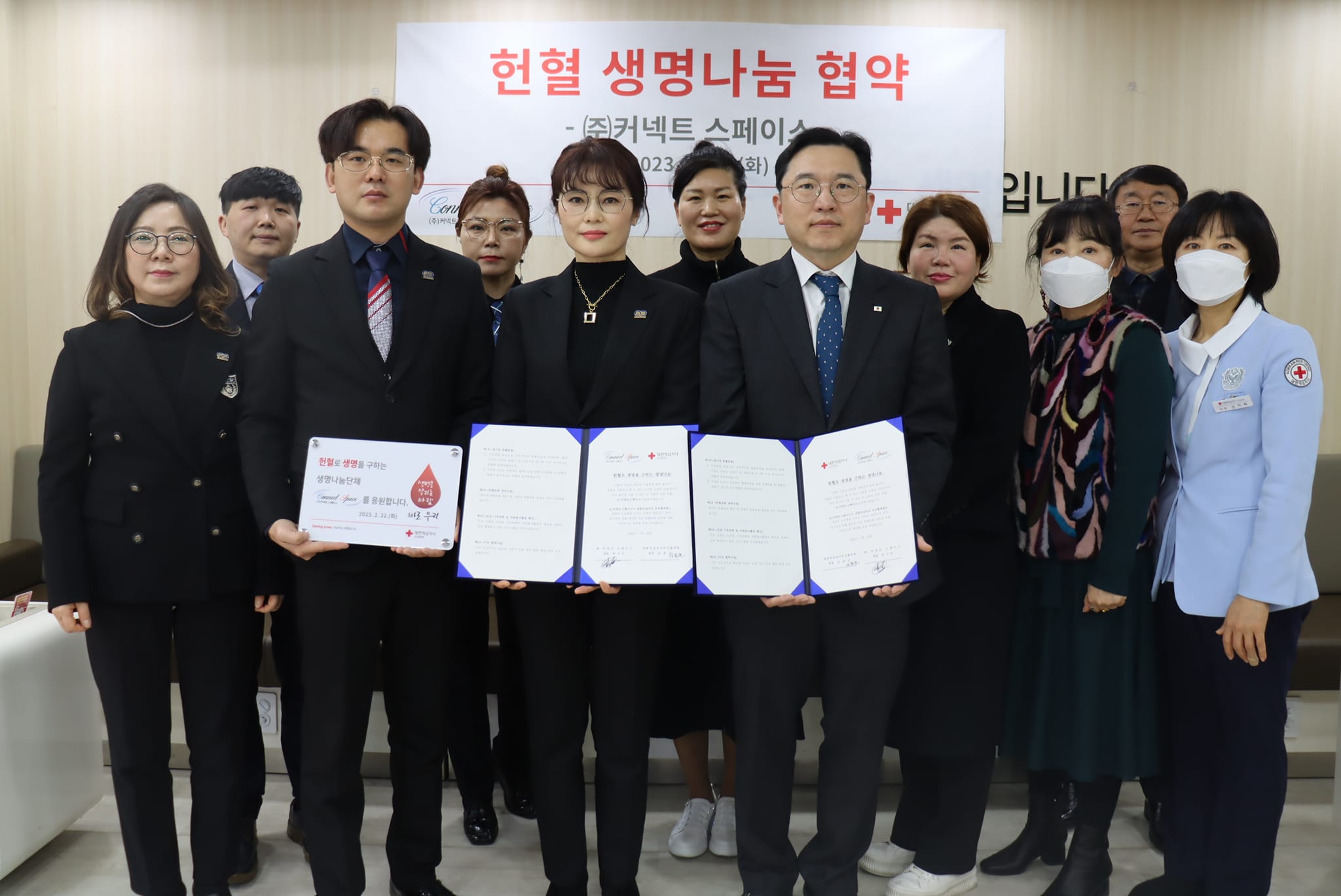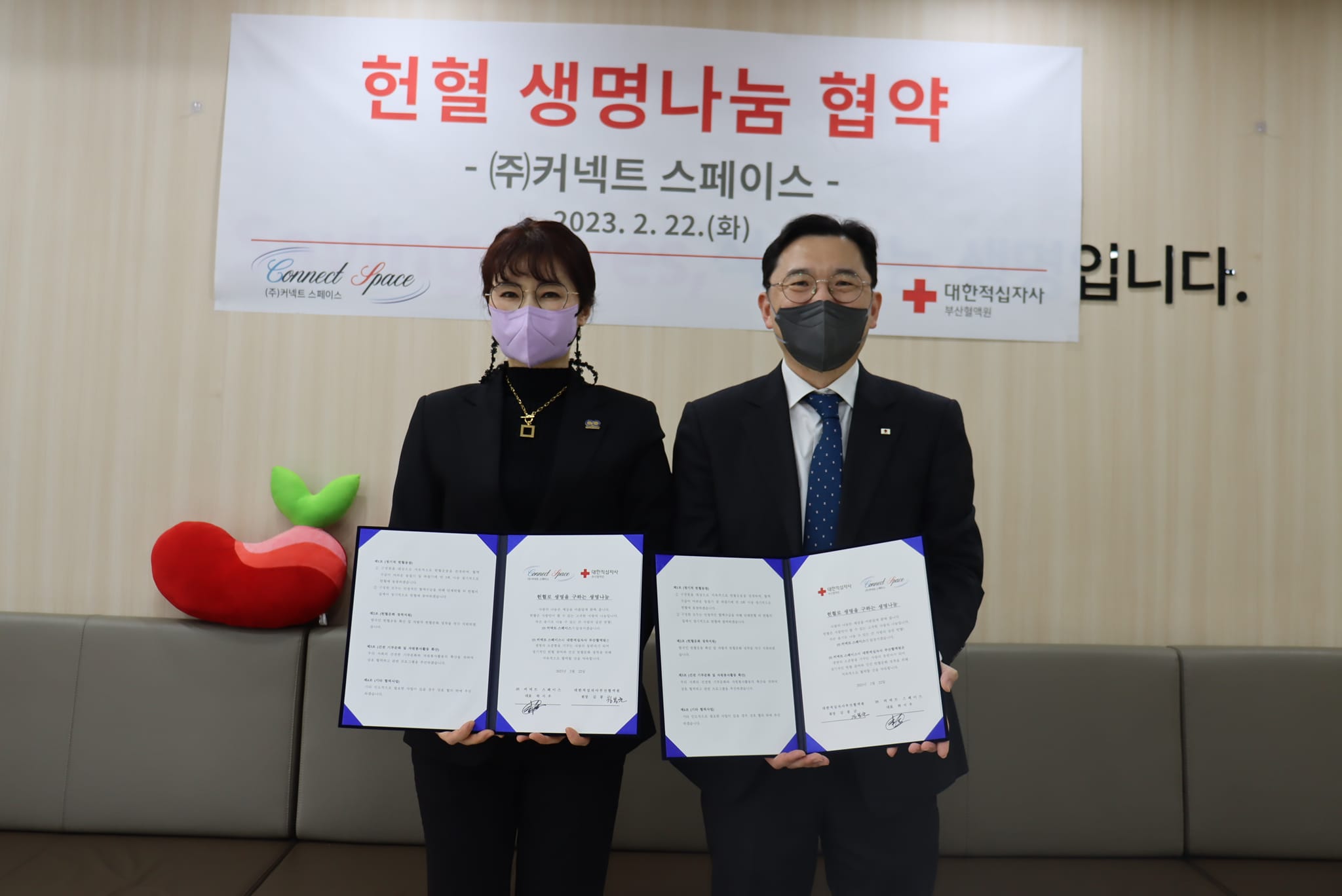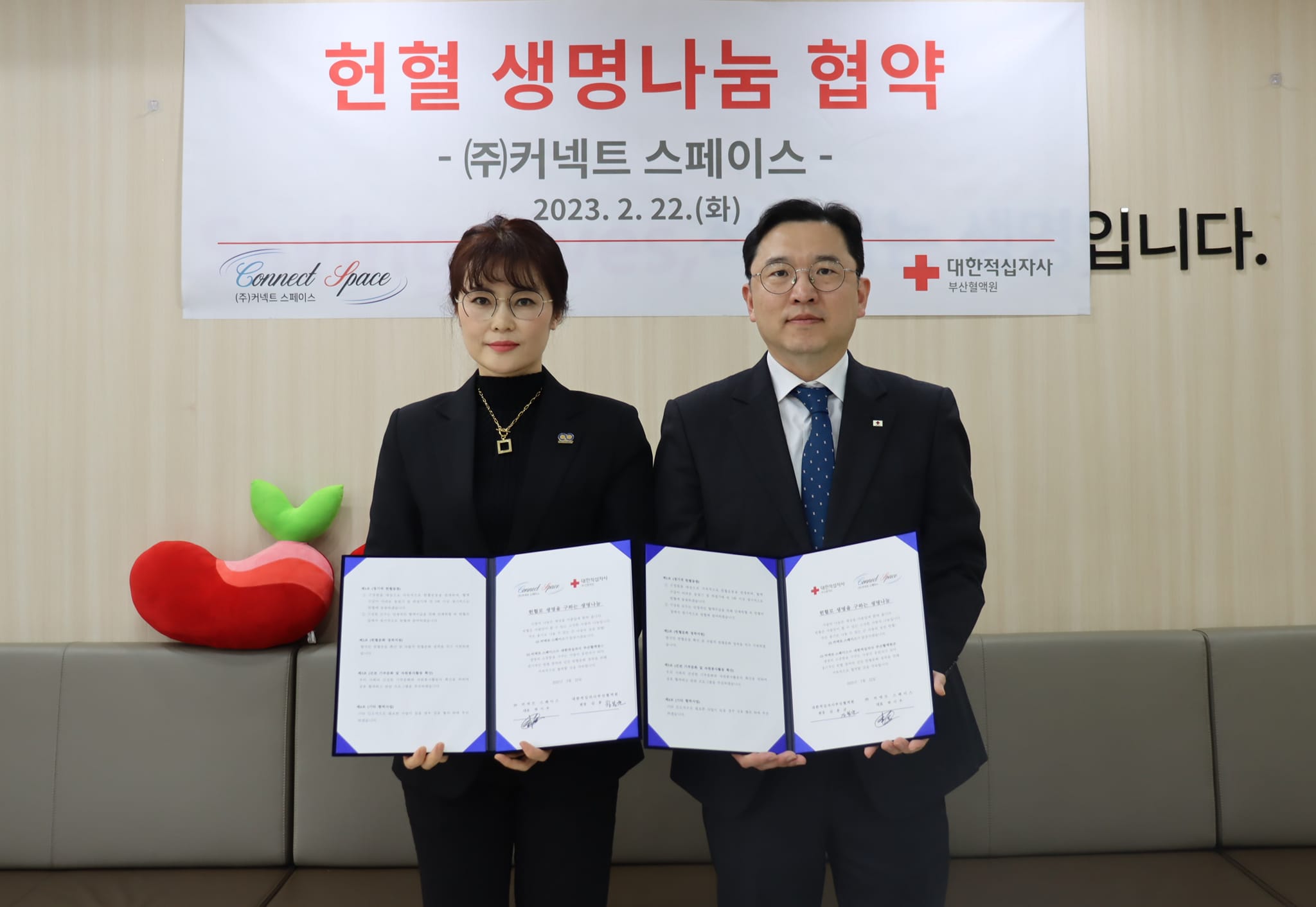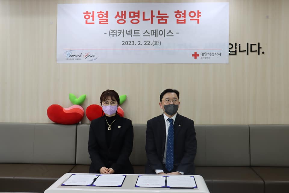 (주) 커넥트스페이스 (대표 하시우, 대표 남성화)가 지난 22일 생명의 소중함을 가꾸는 사랑의 동반자 대한적십자사 부산혈액원과 헌혈로 생명을 구하는 생명나눔 파트너사로 상호 협력을 위해 손을 잡았다.