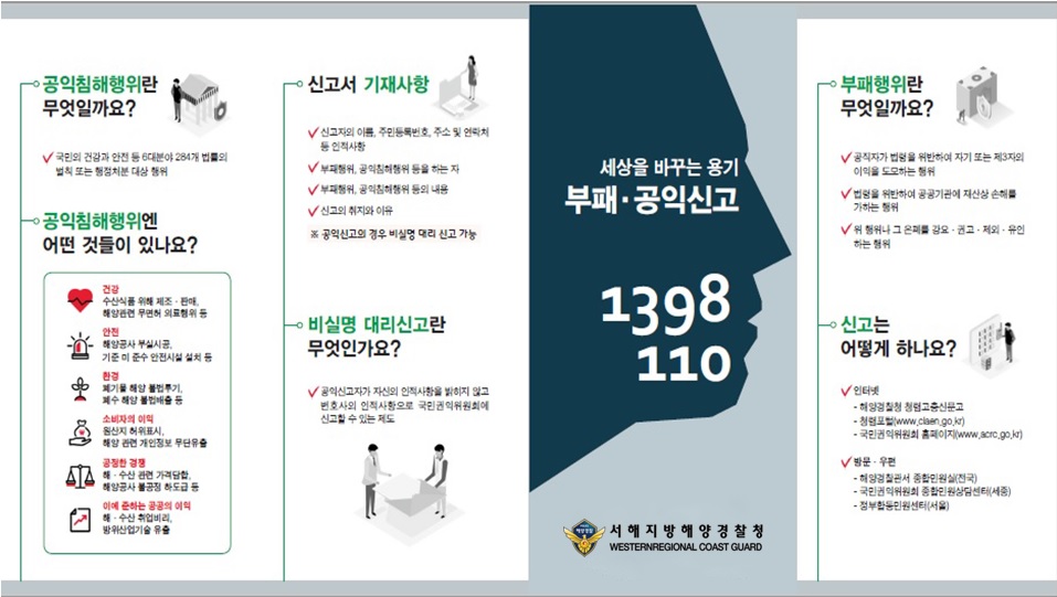 이에 따라 서해해경은 ‘세상을 바꾸는 용기 공익·부패 신고 1398 또는 110’ 리플렛 및 ‘청탁금지법 꼭 이것만은 알고 갑시다!’ 팸플릿을 제작해 일선 해양경찰서 등에 게시하고 배포 한다.