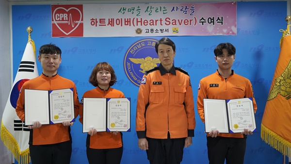 전남 고흥소방서(서장 문병운)는 2일 도양119안전센터 소속 소방위 마정남, 소방교 정영도, 선종준에게 하트세이버(Heart Saver) 인증서를 수여했다.