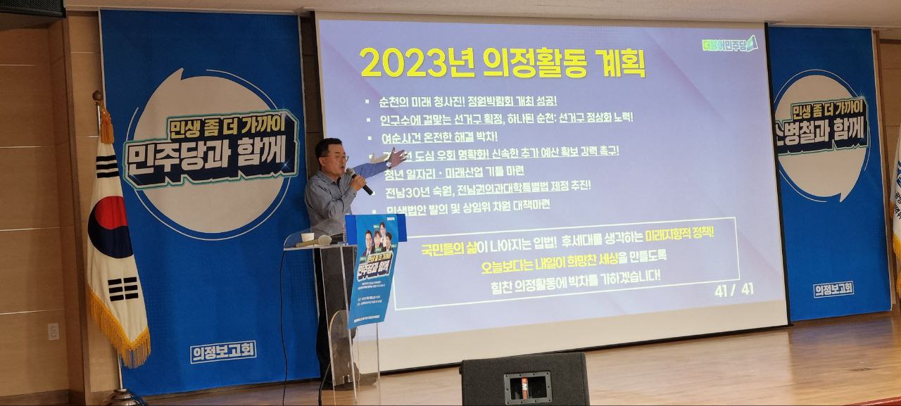 또한 전남도·순천시와 협조해서 역대 최다 예산확보, 부족한 외국인 노동인력 해소 등 각종 민원해결 성과도 상세히 설명해 참석자들로부터 몇차례나 박수세례를 받았다.