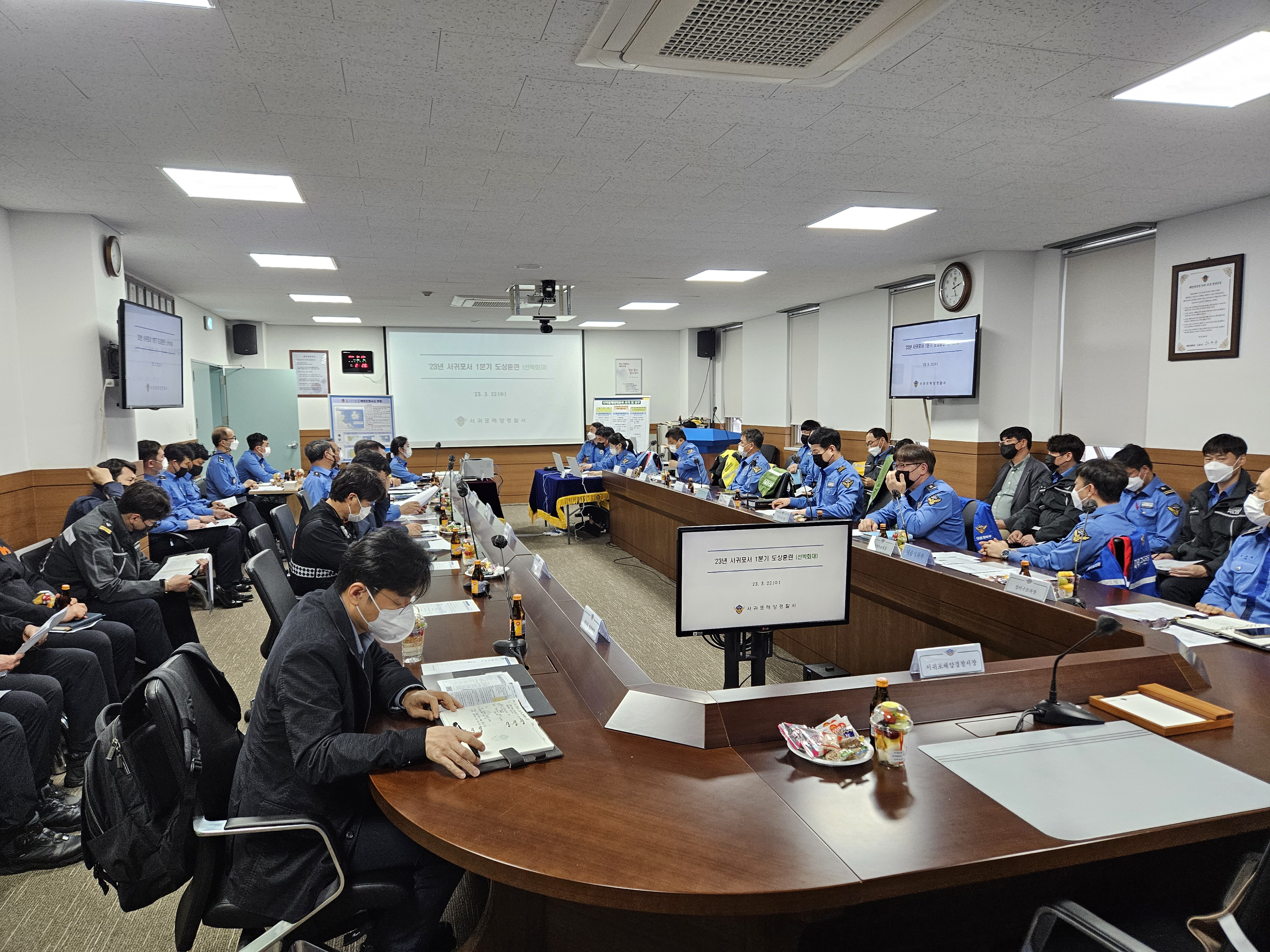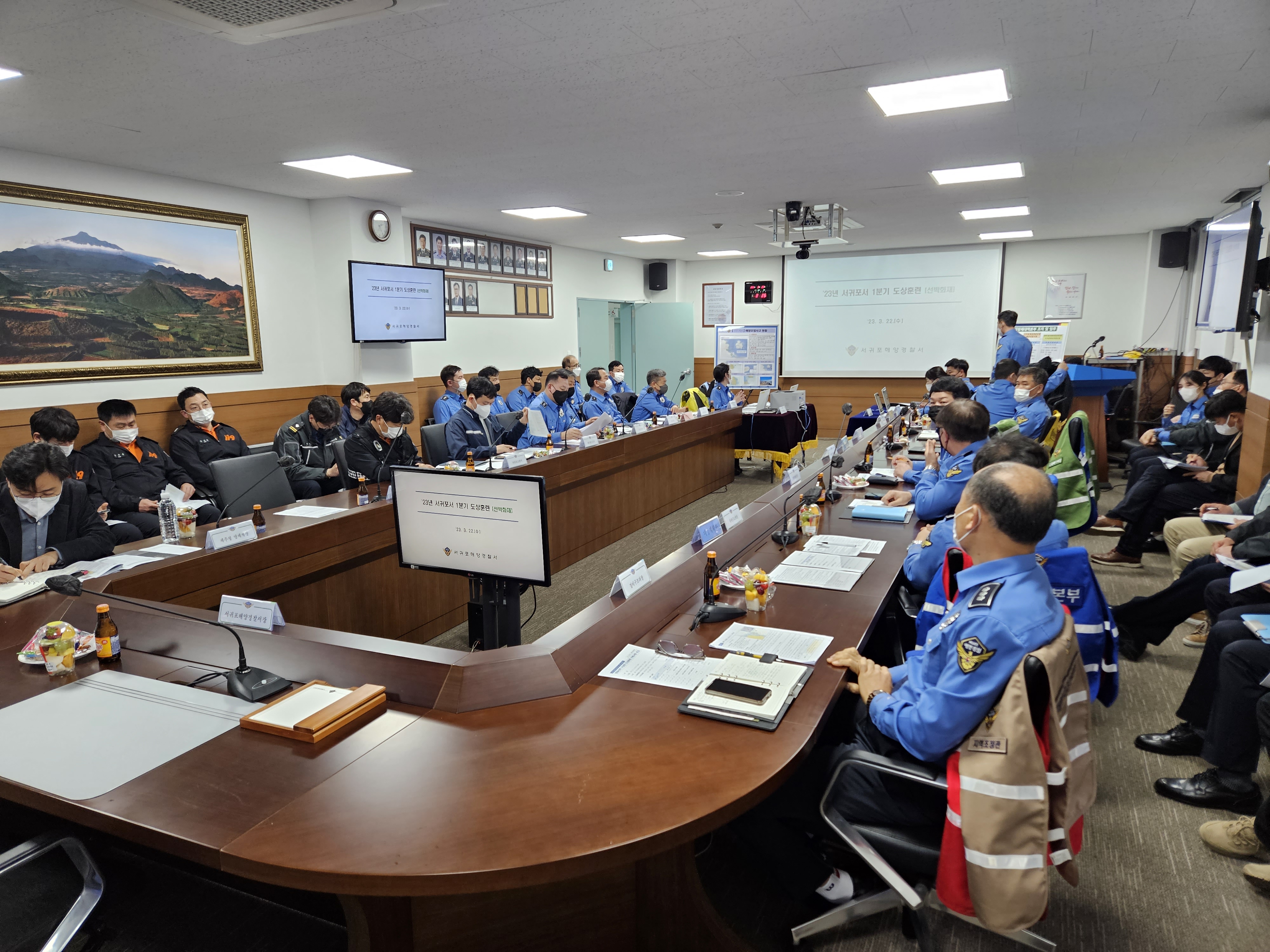 서귀포해양경찰서(서장 윤태연)는 오늘(22일) 화재진압‧인명구조‧해양오염 방제조치 등 복합 해양사고 대비 지역구조본부‧방제대책본부 운영 도상훈련※을 실시했다고 밝혔다.