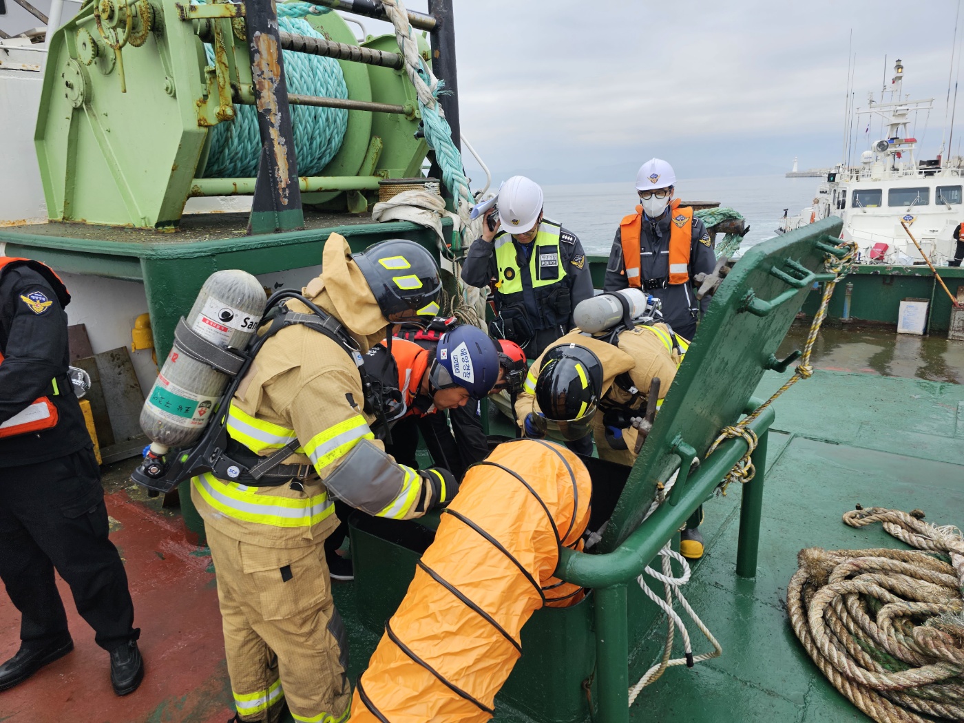 포항해양경찰서 구조세력은 추가피해를 예방하기 위해 방화장비를 착용하고 A호에 올라타