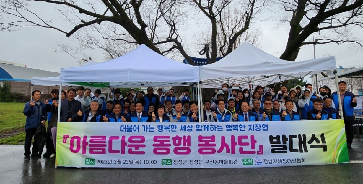 사단법인 전남지체장애인협회(협회장 업무대행 김종택)는 장애인의 사회참여확대를 통한 장애인에 대한 사회인식개선을 위해 지난 23일에 『아름다운 동행 봉사단』발대식과 2023년 제1차 봉사활동을 장성군 장성읍 구산동 마을 일원에서 전라남도의회 김회식의원, 정철의원, 장성군주민복지과장, 전남장애인체육회 상임부회장, 한국장애인고용공단 전남지사장 등 봉사단원 70여명이 참석한 가운데 발대식 및 봉사활동이 진행됐다고 밝혔다.