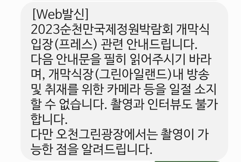 조직위 홍보실은 2023순천만국제정원박람회 개막식에 참석하는 언론인여러분께 라며 개회식장 비표 발급과 관련하여 안내드린다며 보낸 문자에는 취재를 위한 개회식장 카메라 반입금지 통보를 했다.