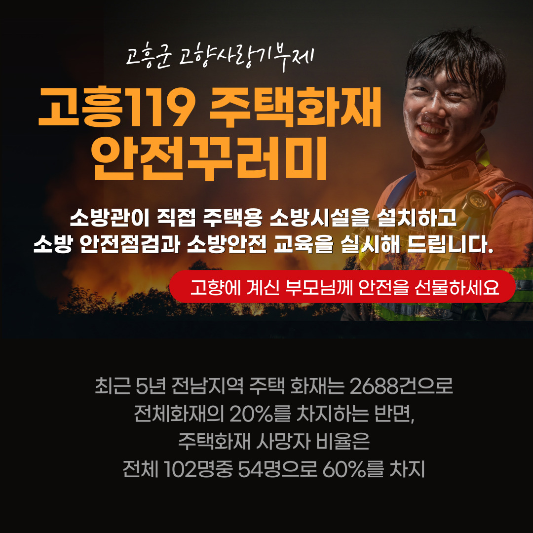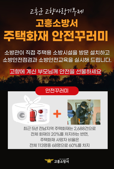 주택화재 안전 꾸러미 서비스는 고흥소방서가 제안해 최근 열린 고흥군 고향사랑과 답례품 선정위원회 심의를 통해 채택됐다. 기부를 통해 고향 사랑을 실천하고 동시에 고향집 부모님의 안전도 선물하는 일석이조의 효과가 있다.