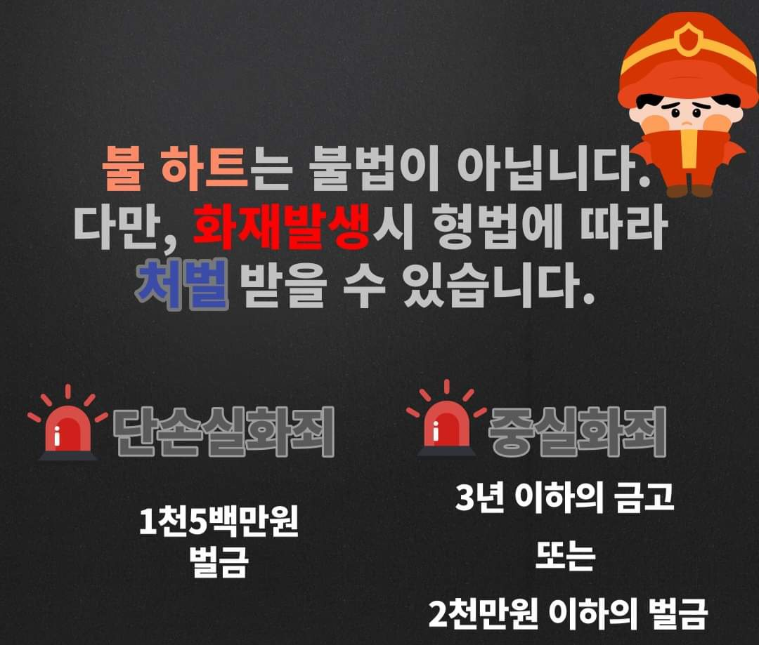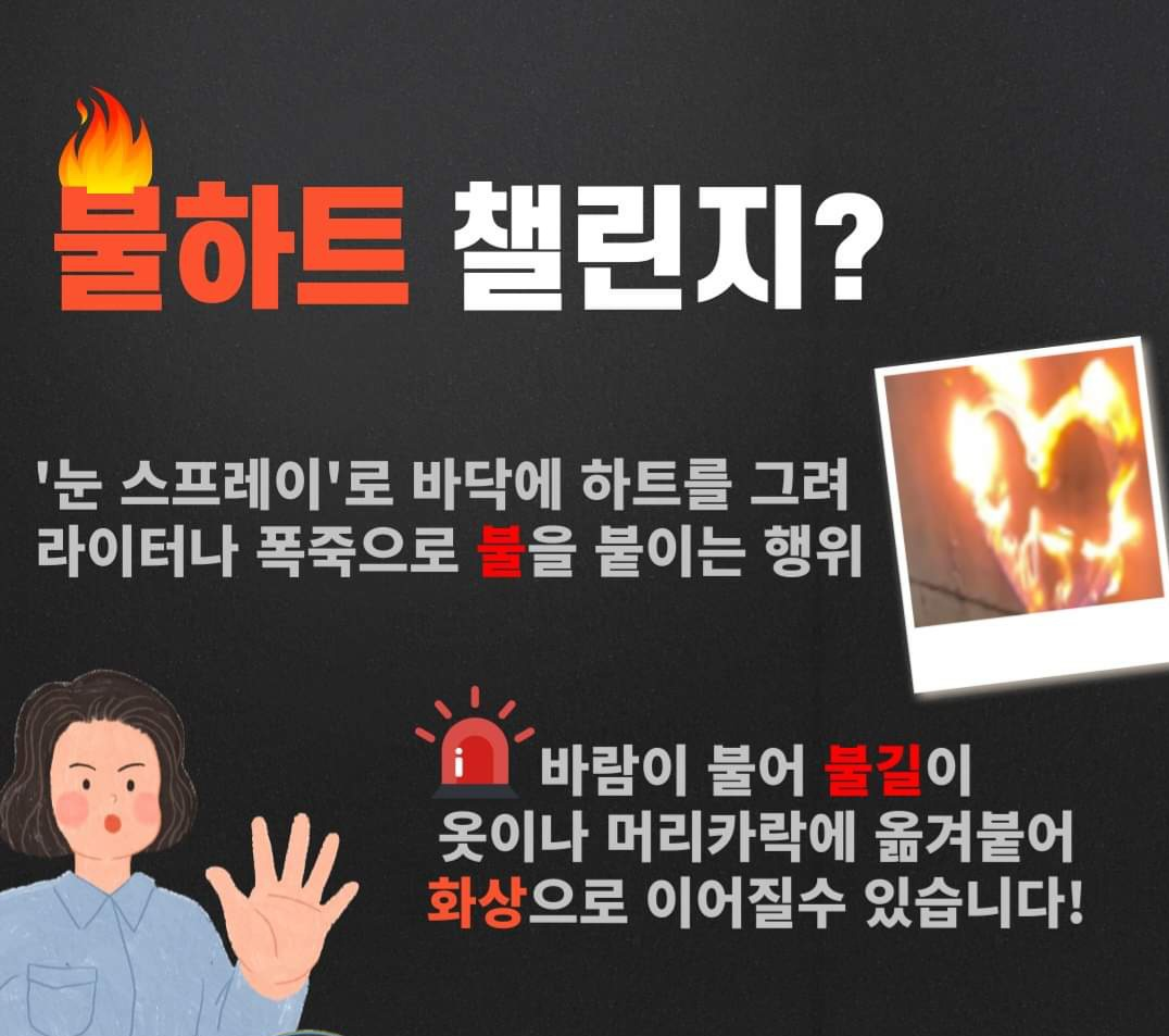 서승호 광양소방서장은 “호기심에 의한 불장난으로 자칫 큰 화재나 부상으로 이어질 수 있는 ‘불 하트’ 놀이를 자제하길 바라며, 안전을 위해 유행을 거스르는 용기 있는 성숙한 시민의식을 기대한다.”라고 말했다.