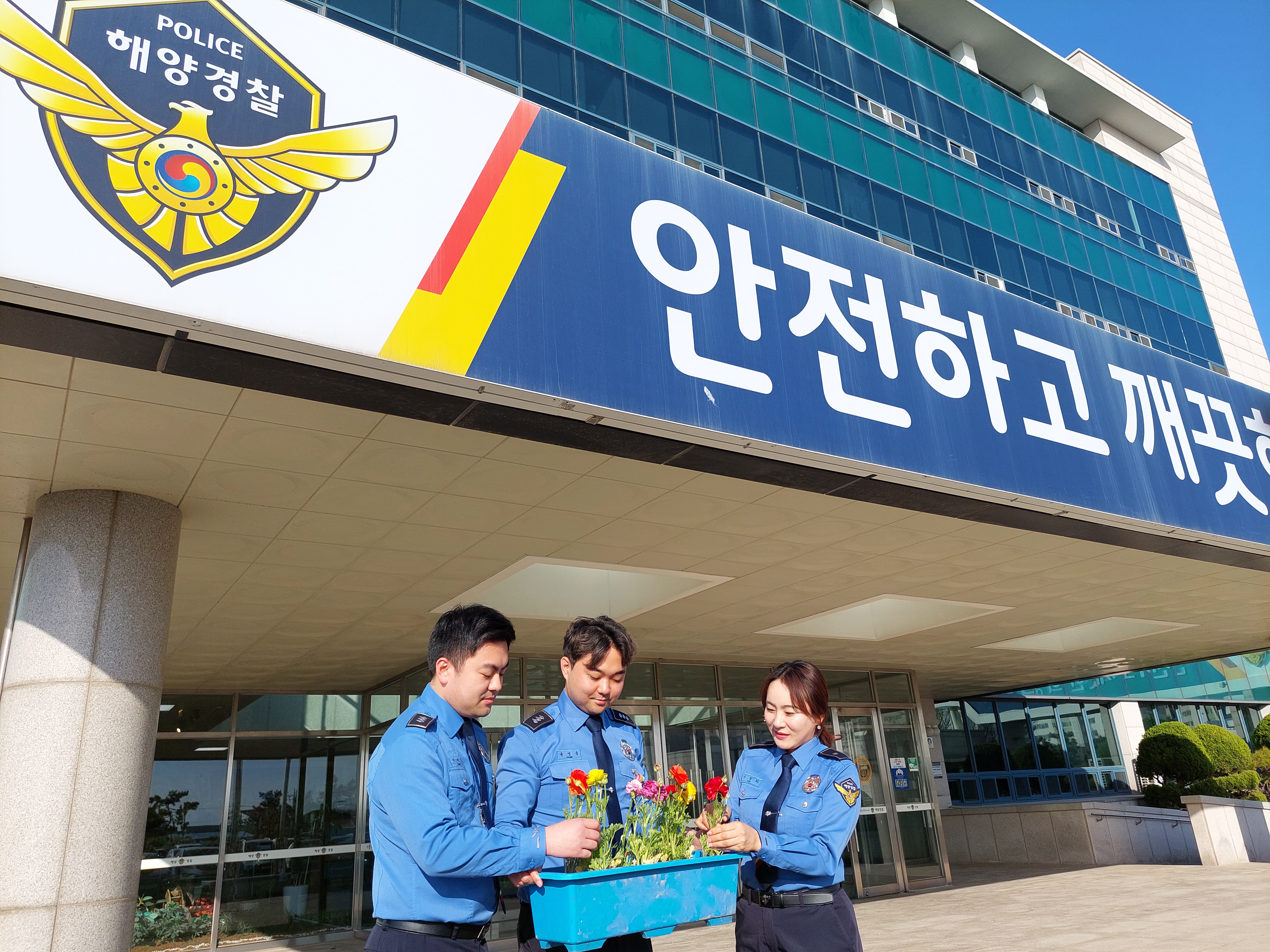 목포해양경찰서(서장 김해철) 경찰관들이 식목일을 앞두고 청사 건물 입구에서 봄꽃(라넌큘러스)을