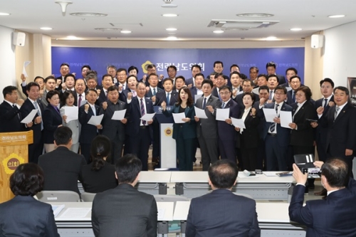 전남도의회(의장 서동욱)는 4일 제370회 임시회 본회의에서 일본 정부의 역사왜곡을 규탄하는 포퍼먼스를 벌였...