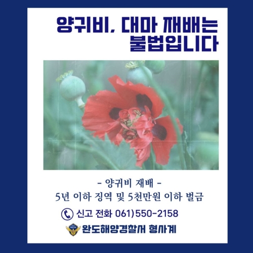 완도해양경찰서(서장 박기정)는 양귀비 개화기와 대마 수확기가 다가옴에 따라 4월 3일부터 7월 31일까지 대...
