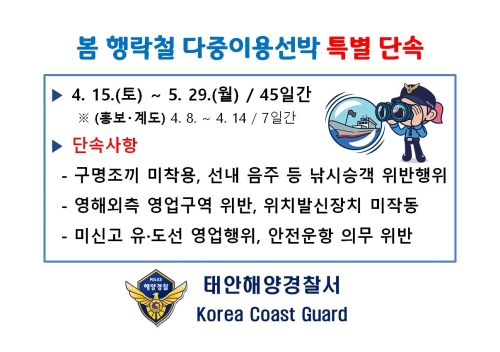 - 다중이용선박 이용객 증가 예상 선제적 대응에 나서 - 태안해양경찰서(서장 송민웅)는 봄철 다중이용선박 이...