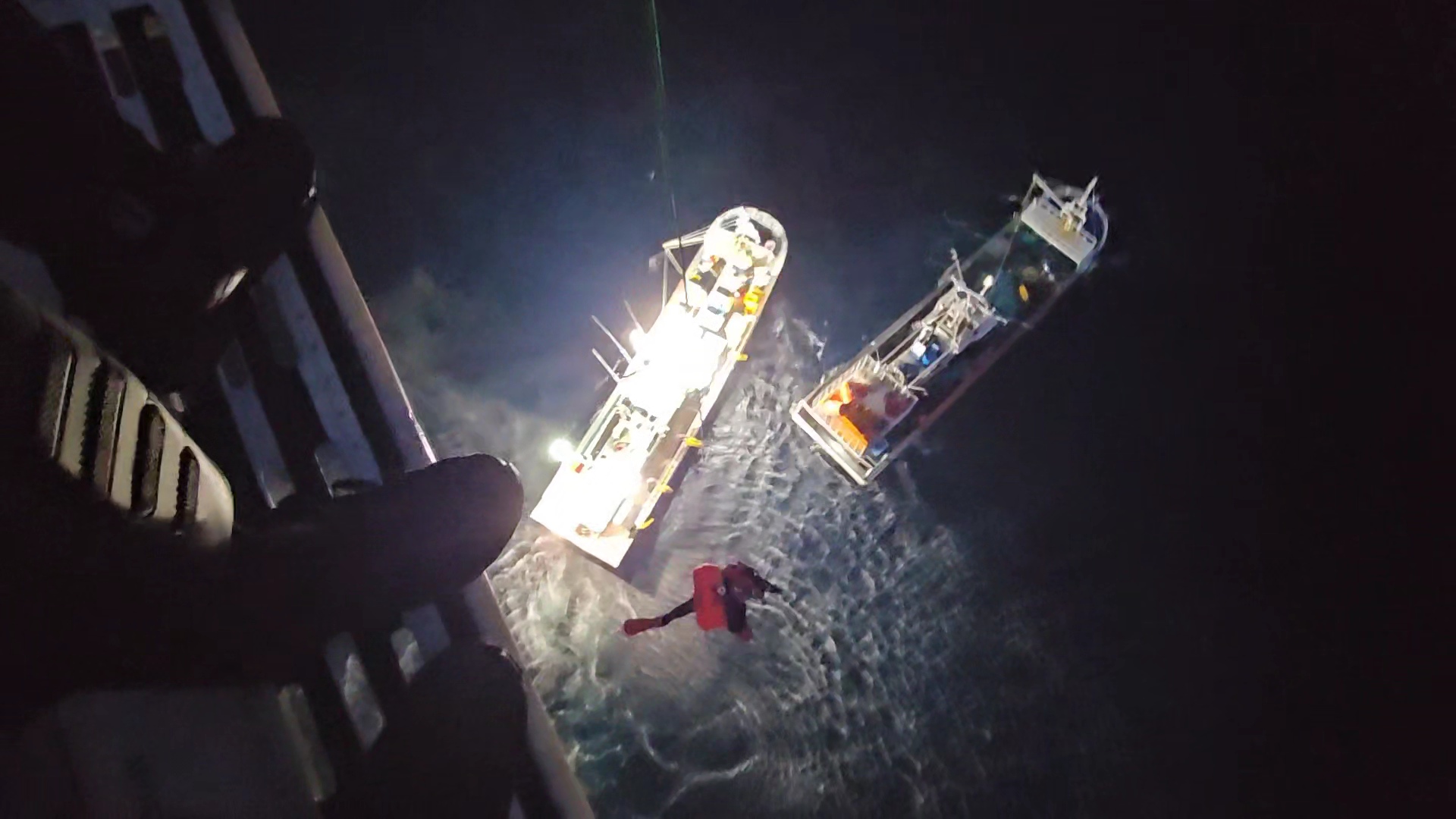 이어 현장에 도착한 동해해경청 헬기에서 구조사 2명이 호이스트 이용 하강해서 구명벌(10인용)을 투하하고 침수 선박에 등선했다.