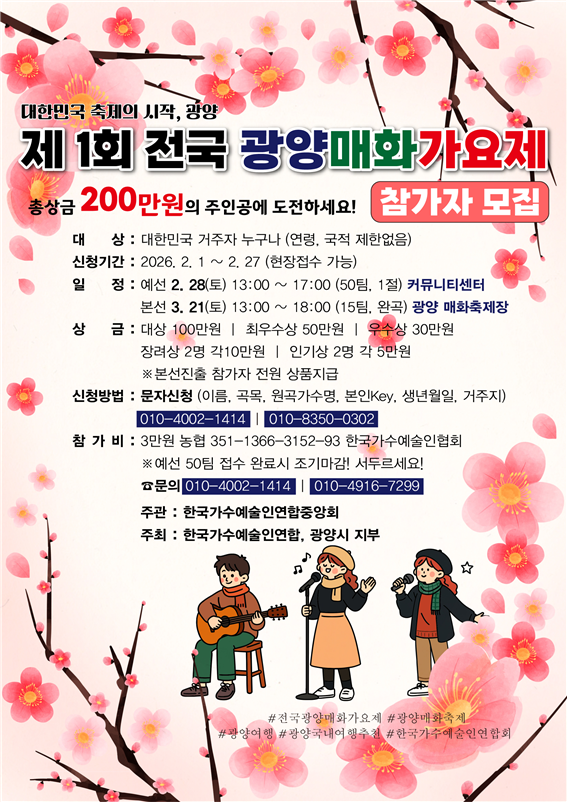 광양 매화의 아름다움을 전국에 알릴 **‘제1회 전국 광양매화가요제’**가 참가자를 모집한다.
