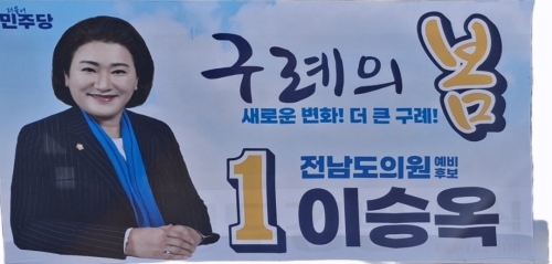 이승옥 전남도의원 예비후보가 구례 중심가에 건 대형 현수막 (출처=이승옥) 제9회 전국동시지방선거를 앞두고 ...