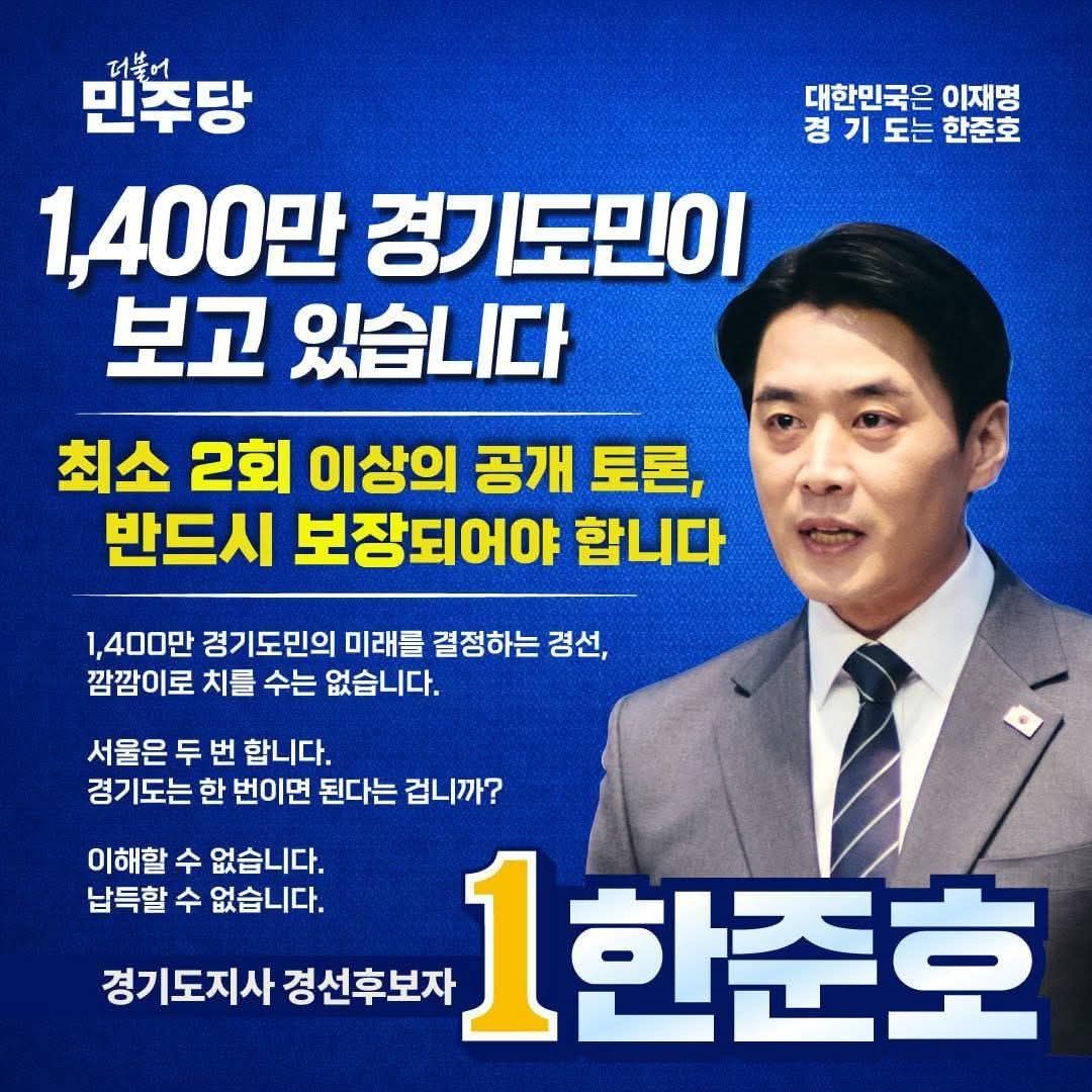 한준호 의원은 “토론을 더 하자는 것은 문제 제기가 아니라 후보라면 당연히 해야 할 의무를 다하자는 것”이라며 “1,400만 경기도의 미래를 결정하는 경선인데 단 한 번의 토론으로 후보의 정책과 비전을 충분히 검증하기는 어렵다”고 밝혔다.