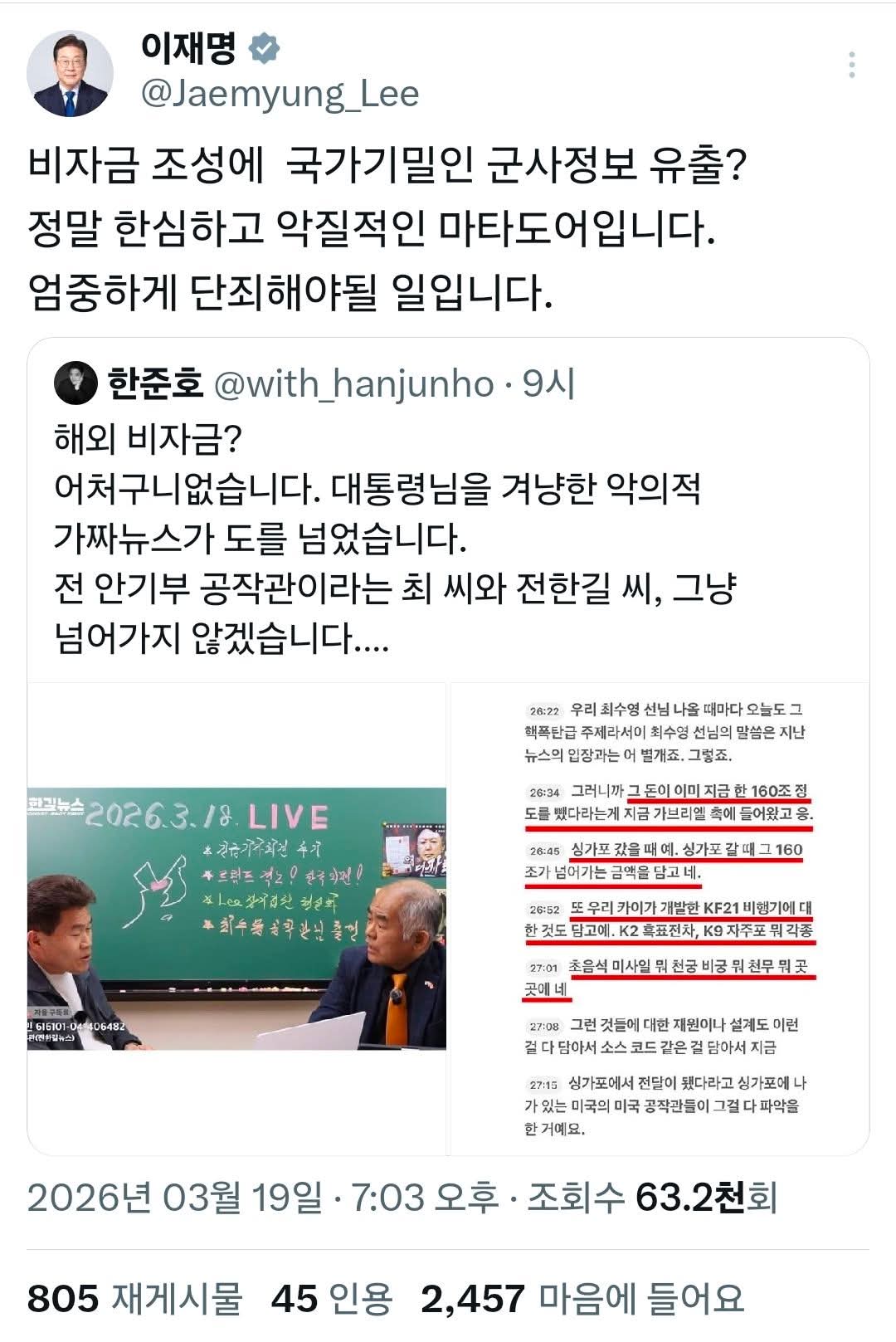 이 대통령은 19일 SNS를 통해 한준호 의원의 트윗을 공유하며 “비자금 조성에 국가기밀인 군사정보 유출까지 연결하는 주장은 정말 한심하고 악질적인 마타도어”라고 밝혔다. 이어 “엄중하게 단죄해야 할 사안”이라고 강조하며 강경 대응 의지를 분명히 했다.