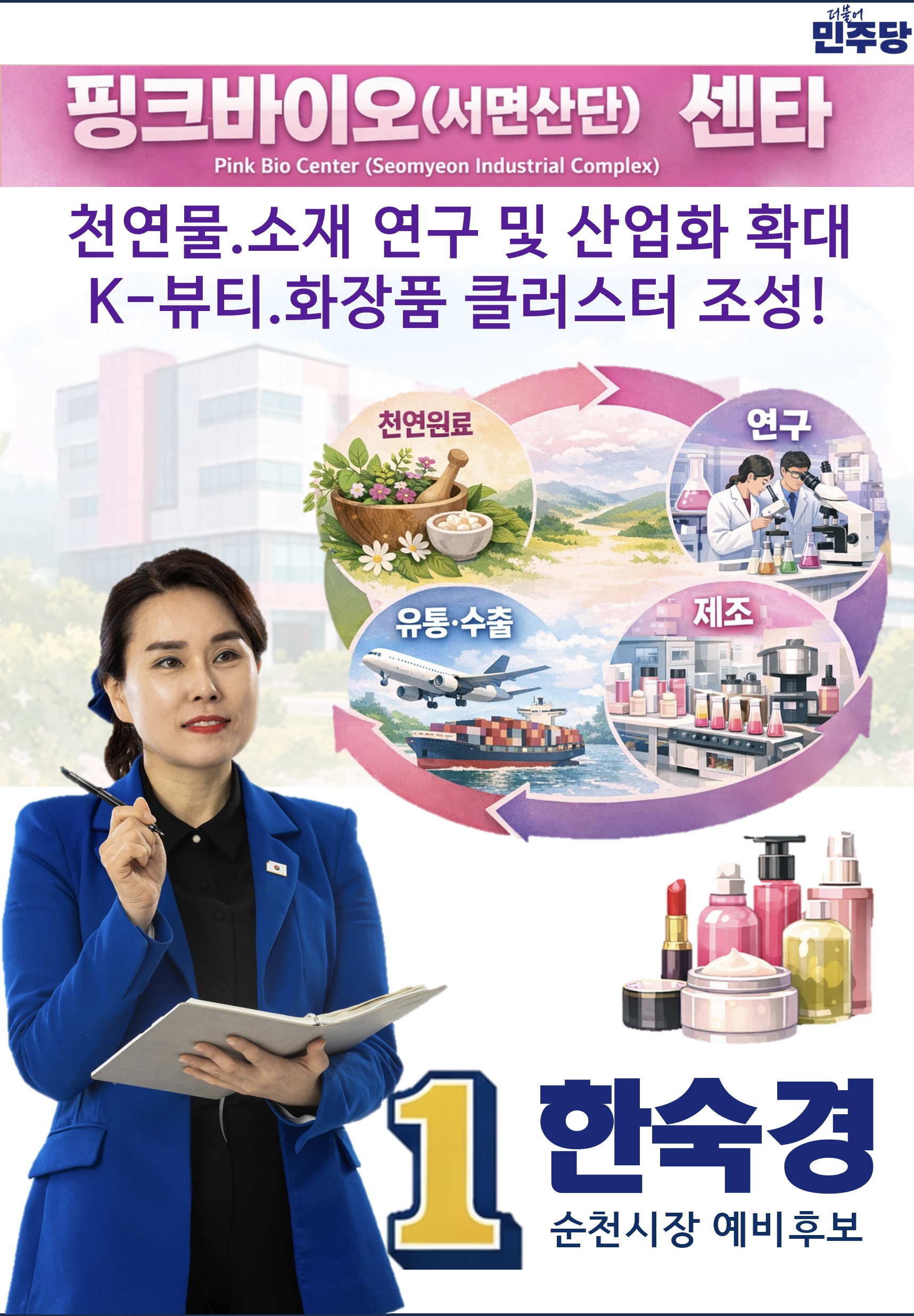 또한 그린바이오 기반 천연 원료 산업과 연계한 핑크바이오 센터 구축을 통해 순천을 K-뷰티 산업의 중심 도시로 성장시키겠다는 전략을 강조했다.