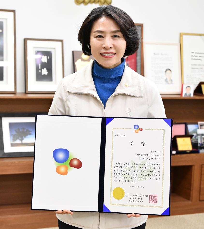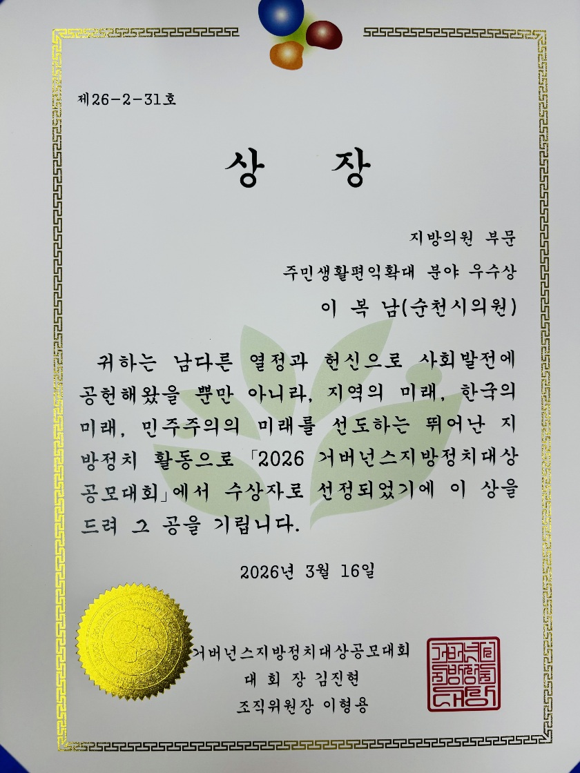 이복남 순천시의회 의원이 ‘2026 거버넌스 지방정치대상’에서 우수상을 수상했다.