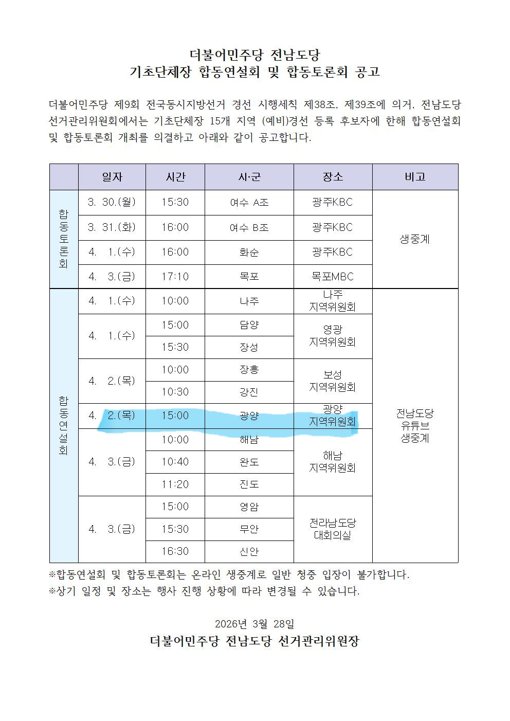 더불어민주당 전남도당 선거관리위원회는 4월 2일 광양지역위원회에서 광양시장 경선 후보자 합동연설회와 합동토론회를 연다.