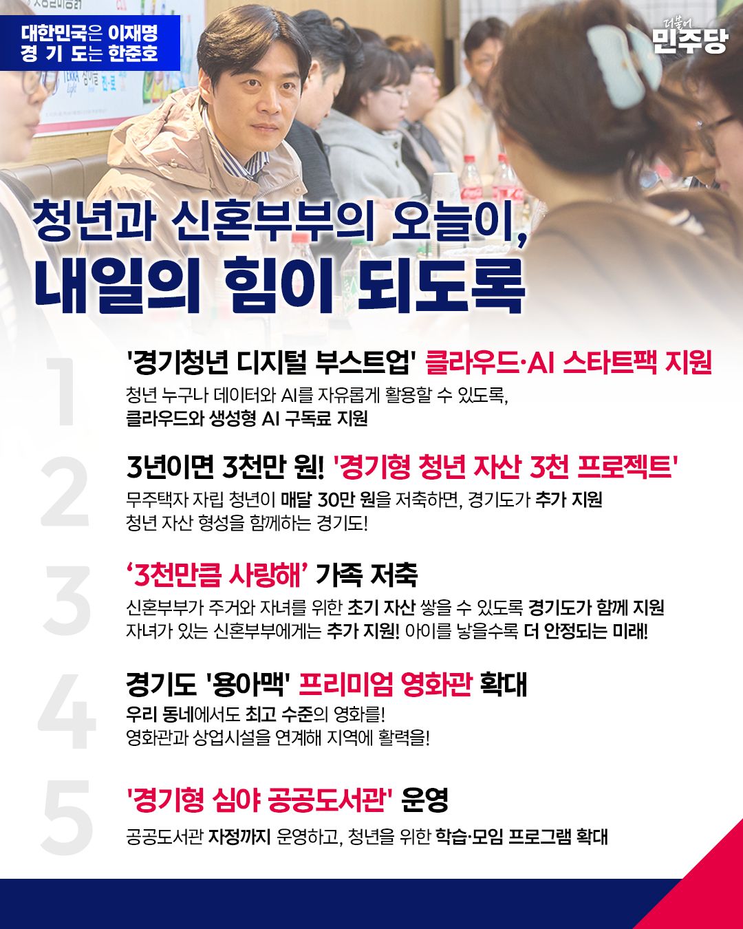 더불어민주당 한준호 경기도지사 예비후보는 청년과 신혼부부의 삶을 실질적으로 바꾸기 위한 종합 정책을 제시하며 “지금의 어려움을 줄이고, 미래를 준비할 수 있는 경기도를 만들겠다”고 밝혔다.