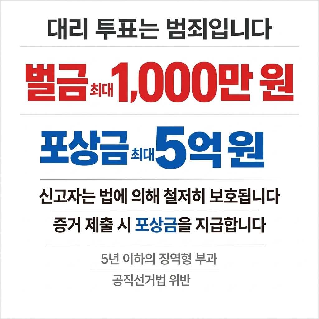 공직선거법 제248조에 따르면, 본인이 아닌 사람이 대신 투표하는 이른바 ‘대리투표’는 형사처벌 대상이며, 5년 이하의 징역 또는 1천만 원 이하의 벌금이 부과될 수 있다. 부탁하거나 지시한 경우에도 처벌 대상이 될 수 있다.